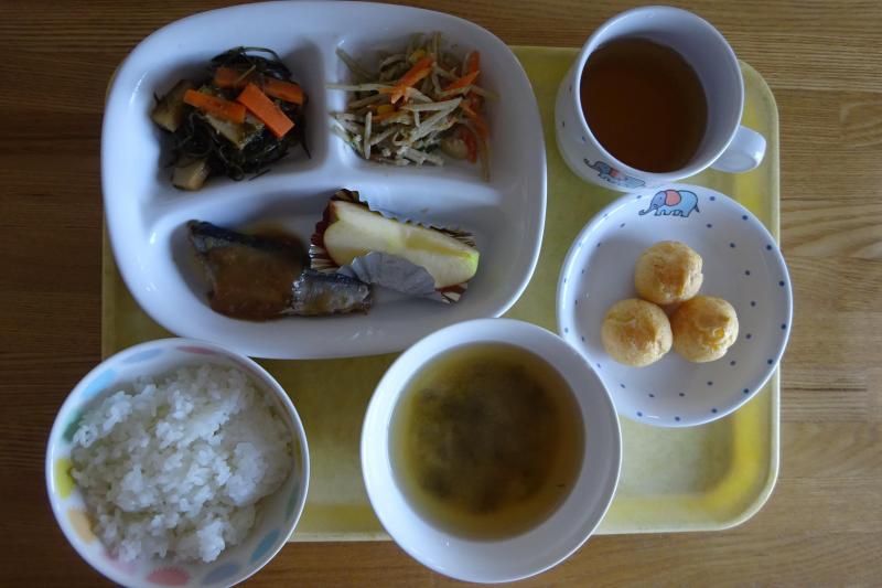 *ランチメニュー *おやつ ・あじのカレー竜田揚げ ・スティックパン ・豚肉と大根のみそ煮 ・麦茶 ・小松菜のさっぱり和え ・かきたま汁 ・りんご |