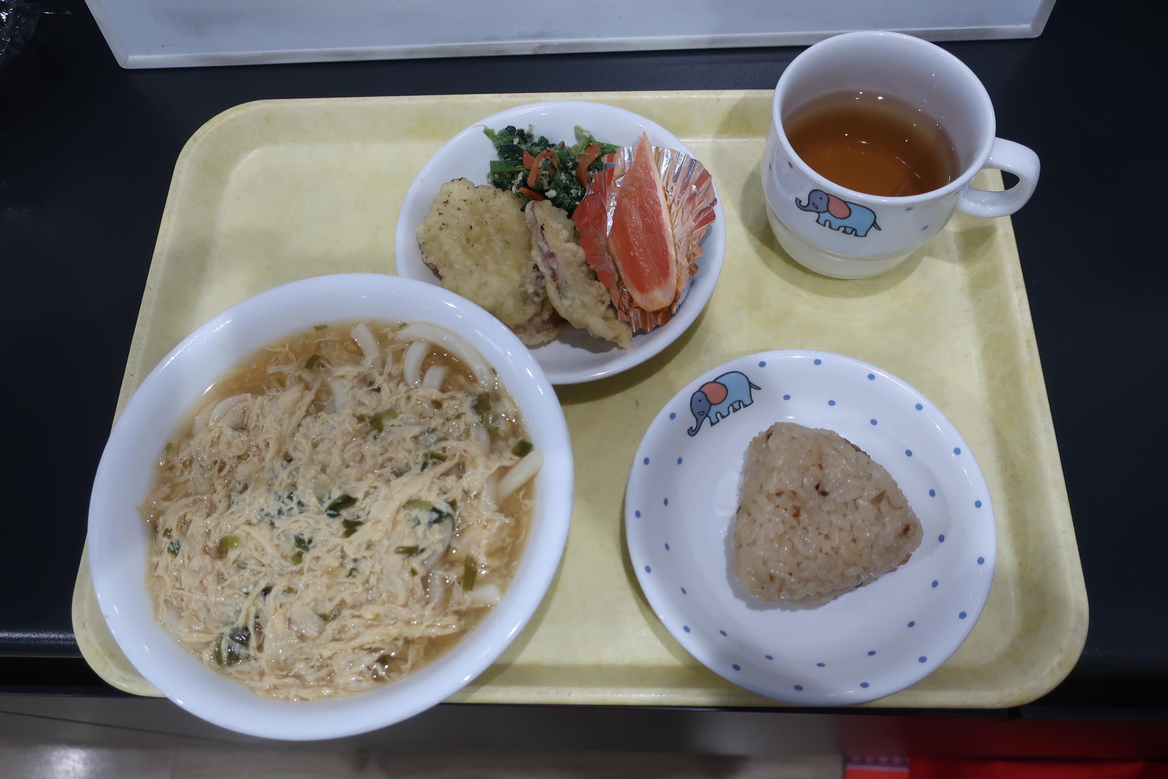 【昼食】 かきたまうどん・さつまいも天・ほうれん草のそぼろ和え・グレープフルーツ