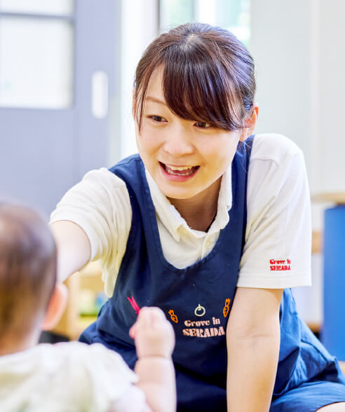家庭の事情で1度退職しましたが、他園を経験後、縁あって再び入職しました。世良田の杜では「大事な時期だからこそ、しっかり育てたい」という保育理念のもと、大きな一歩柱を軸に、同じ方向に向かって職員が切磋琢磨しています。ひとりひとりの良いところを認め合い、笑顔にしてくれる人がいるこの職場で、誇りと自信をもって、成長できる場を築いていきたいと思いながら、保育にあたっています。